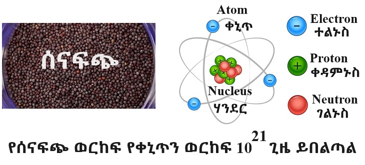 ይሆናል። ይህ ማለት የሰናፍጭ ወርከፍ (size) የቀኒጥን ወርከፍ 1021 ጊዜ ማለትም ሳብጃኖ ጊዜ (sextillion times) [sextillion = zeta = 1021 = (103)7] ይበልጣል ማለት ነው። በሌላ አባባል በቅንጣት ሰናፍጭ ውስጥ በቅርበዛ ሳብጃኖ ቀኒጦች (sextillion atoms)፣ ማለትም 1021 ቀኒጦች ይገኛሉ ማለት ነው። የቀኒጥ ቱኒፍነት እስከዚህ ድረስ ነው።