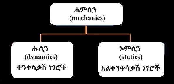 ሑሲን (dynamics) እና ኑምሲን (statics) ከሚሉት ሐምሲን (mechanics) የሚለውን ቃል እናገኛለን። ሐምሲን (mechanics) ሑሲንን እና ኑምሲንን የሚያጠቃልል የጉሲን ዘርፍ (branch of physics) ነው። በሌላ አባባል ሐምሲን ማለት የሚንቀሳቀሱም፣ የማይንቀሳቀሱም ነገሮች የሚጠኑበት የጉሲን ዘርፍ ነው።