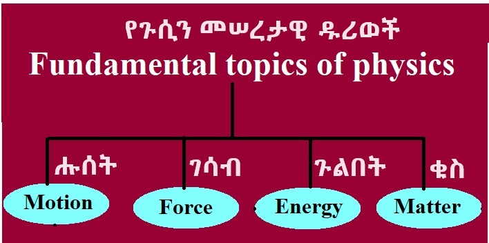 በጉሲን ውስጥ የሚጠኑት አራቱ መሠረታዊ ዱሪወች (the four fundamental topics of physics) ሑሰት (motion)፣ ግሳብ (force)፣ ጉልበት (energy) እና ቁስ (matter) ናቸው።