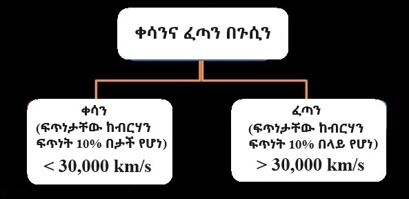ብያኔ (definition)፡ በጉሲን (physics) ውስጥ ፍጥነቱ የብርሃንን ፍጥነት (300,000 km/s) 10% በላይ የሆነ (ማለትም ፍጥነቱ ከ 30,000 km/s በላይ የሆነ) አካል ወይም የአካል ስርካት ፈጣን (fast) ሲባል፣ ፍጥነቱ የብርሃንን ፍጥነት 10% በታች የሆነ (ማለትም ፍጥነቱ ከ 30,000 km/s በታች የሆነ ) አካል ወይም የአካል ስርካት ደግሞ ቀሳን (slow) ይባላል።