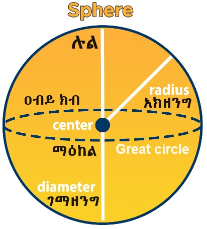 አክባቢ ዘንግ ከሚለው ሐረግ አክዘንግ (radius) የሚለውን ቃል ስናገኝ፣ ገማሽ ዘንግ ከሚለው ሐረግ ደግሞ ገማዘንግ (diameter) የሚለውን ቃል እናገኛለን። አክዘንግ ማለት ከክብ እምብርት ወይም ማዕከል (center) እስከ ክብ ጠርዝ የሚሰመር፣ ማለትም ከማዕከሉ ተነስቶ ክብን የሚያካብብ መስመር ማለት ነው። ገማዘንግ ማለት ደግሞ በክብ ላይ በማለፍ ክብን ለሁለት እኩሌታ የሚገምስ መስመር ማለት ነው። የገማዘንግ ርዝመት የአክዘንግን ርዝመት ሁለት እጥፍ ነው።