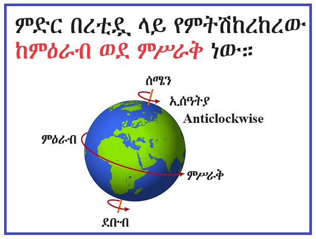 ምድር በረቲዷ (axis) ማለትም በዛቢያዋ ላይ የምትሽከረከረው ከምዕራብ ወደ ምሥራቅ (from west to east) ነው። ይህ ማለት ደግሞ ምድርን ከሰሜን ዋልታ በላይ ሁነው ወደታች ሲመለከቷት የምትሽከረከረው ኢሰዓትያ (counterclockwise) ነው (ማለትም የሰዓት ጠቋሚ ከሚሽከረከረበት አቅጣጫ በተቃራኒ ነው) ማለት ነው።