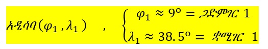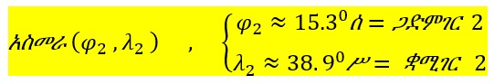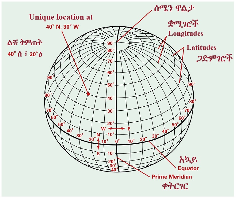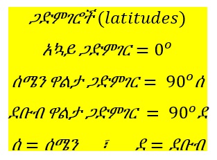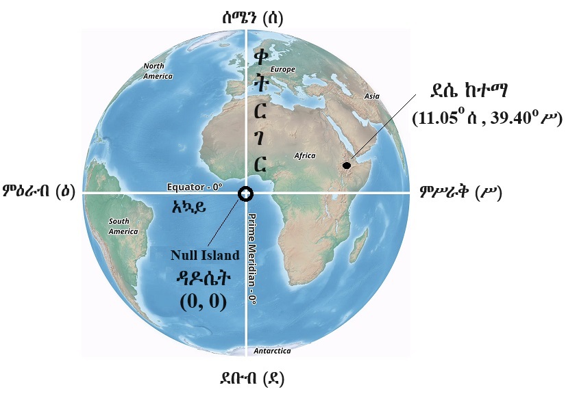 ለምሳሌ ያህል ለራስ ሲቆርሱ አያሳንሱ ነውና፣ እኔ መስፍን አረጋ የተወለድኩባት ደሴ ከተማ የምትገኘው ከአኳይ (equator) በስተሰሜን 11.05o ላይ (ማለትም 11.05oሰ ላይ) ፣ ከቀትርገር (prime meridian) በስተምሥራቅ ደግሞ 39.40o ላይ (ማለትም 39.40oሥ ላይ) ነው።