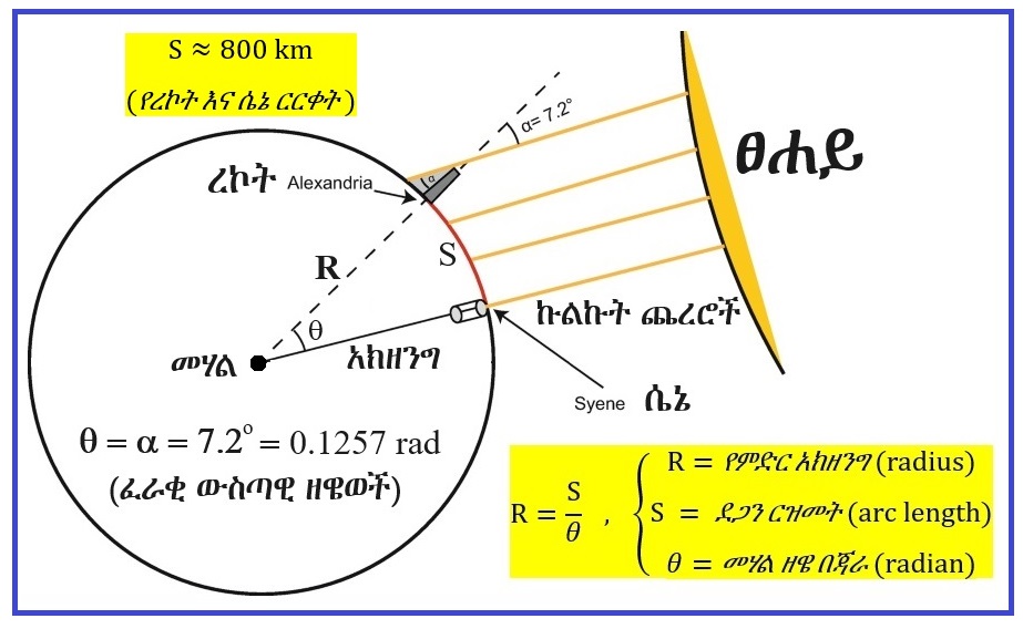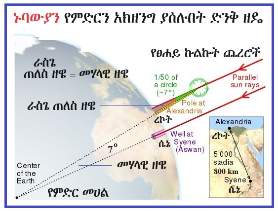 ኑባውያን የምድርን ሉልነት ማውቅ ብቻ ሳይሆን፣ የሉሉን አክዘንግ (radius) ደግሞ በሚከተለው መንገድ በቀላሉ ማስላት ችለው ነበር።