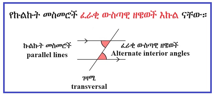 ገዛሚ መስመር (transverse line) ከኩልኩት መስመሮች (parallel lines) ጋር ስለሚሠራቸው ፈራቂ ውስጣዊ ዘዌወች (alternate interior angles) እንዲሁም ፈራቂ ውጫዊ ዘዌወች (alternate exterior angles) እና ወልታቢ ዘዌወች (corresponding angles) ይበልጥ ለመረዳት ነጥቦች፣ መስመሮችና ዘዌወች (Points, Lines & Angles) የሚለውን ጦማር ይመልከቱ።