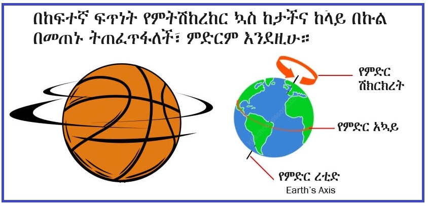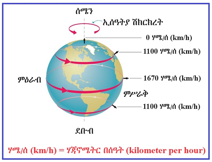 ምድር በረቲዷ ላይ እየተሽከረከረች ባንድ ዕለት (ማለትም በ 24 ሰዓት) እቅጩን አንድ ዙር ትፈጽማለች። በዚህም ምክኒያት በምድር ገጽ ላይ ያለ ማናቸውም ነቁጥ (ከዋልታወች በስተቀር) ለአኳይ (equator) ኩልኩት (parallel) በሆነ ክባዊ ፍኖት (circular path) ላይ በተወሰነ ፍጥነት እየተሽከረከረ ባንድ ዕለት (ማለትም በ 24 ሰዓት) እቅጩን አንድ ዙር ይፈጽማል።