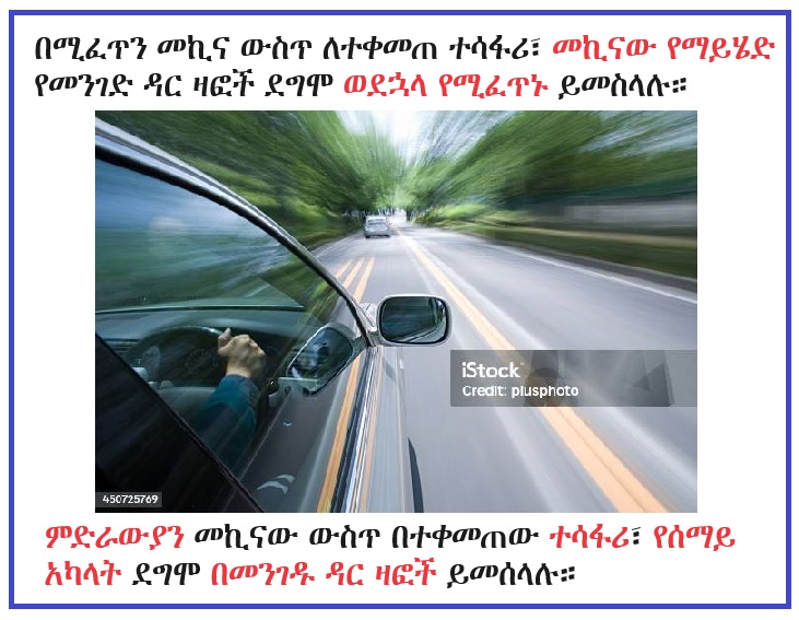 በሚፈጥን መኪና ውስጥ ሁነው መንገድ ዳር የቆሙትን ዛፎች ሲመለከቱ፣ መኪናው ወደ ፊት ሲሄድ ዛፎቹ ወደ ኋላ የሚሄዱ ይመስላሉ። ምድር በረቲዷ (axis) ላይ ከምዕራብ ወደ ምሥራቅ ስትሽከረከር፣ ራማዊ አካላት (heavenly bodies) ከምሥራቅ ወደ ምዕራብ የሚሄዱ የሚመስሉትም በዚሁ ምክኒያት ነው። በሌላ አባባል፣ ራማዊ አካላት በየዕለቱ ከምሥራቅ አድማስ እየውጡ ወደ ምዕራብ አድማስ የሚጠልቁት በእውነትም ከምሥራቅ ወደ ምዕራብ እየሄዱ ሳይሆን፣ በምድር ሽክርክረት ሳቢያ እንጅ ነው።