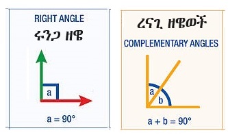 መጠኑ እቅጩን (precisely) ማለትም በትክክል 90o የሆነ ዘዌ፣ ሩንጋ ዘዌ (right angle) ይባላል። ሩንጋ የሚለው ቃል የተገኘው ሮጋ (ማለትም ማዕዘን ) ከሚለው የኦሮምኛ ቃል ነው። ሲደመሩ ሩንጋ ዘዌ (right angle) ማለትም 90o የሚሰጡ ዘዌወች ደግሞ ረናጊ ዘዌወች (complementary angles) ይባላሉ። ለምሳሌ ያህል 30o እና 60o ረናጊ ዘዌወች ናቸው፣ እንዲሁም 20o እና 70o ረናጊ ዘዌወች ናቸው።