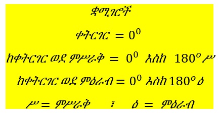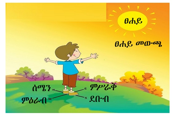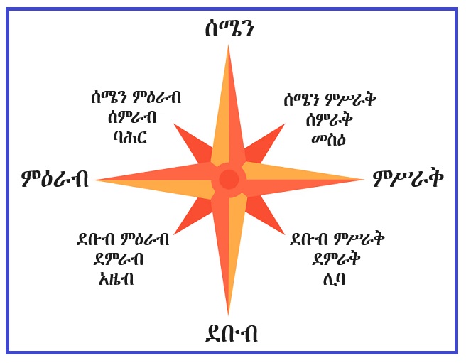 ሁለት እጆቻችንን ወደ ጎንና ጎን ዘርግተን ወደ ፀሐይ መውጫ ብንመለከት ፊታች ወደ ምሥራቅ፣ ጀርባችን ወደ ምዕራብ፣ ቀኝ እጃችን ወደ ደቡብ፣ ግራ እጃችን ደግሞ ወደ ሰሜን ያመለክታሉ።