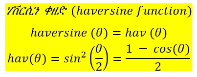 4) ባራተኛ ደረጃ ከመሃላዊው ዘዌ ሄቨርሲን እሴት (haversine value) በመነሳት የመሃላዊው ዘዌ እሴት በጉለም (degree) ወይም በጃራ (radian) ይሰላል።