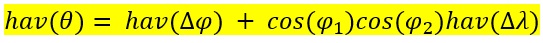 3) በሶስተኛ ደረጃ ጫፎቹ ነጥቦች P1 እና P2 የሆኑት የሉሉ ዐብይ ክብ ደጋን (great circle arc) ከሉሉ መሃል (center) ላይ የሚወጥገው (subtend) መሃላዊ ዘዌ (central angle) ሄቨርሲን እሴት (haversine value) ይሰላል።