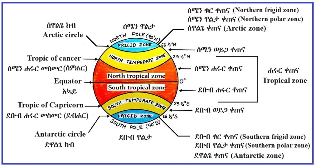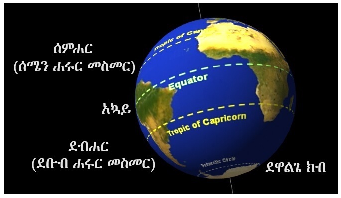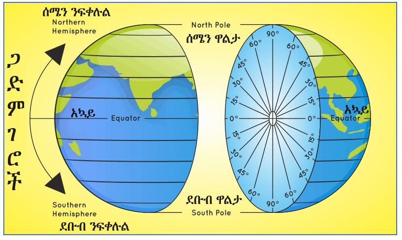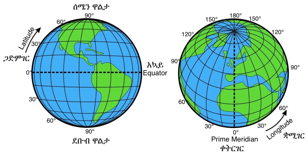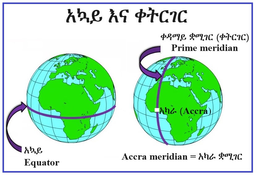 አኳይ (equator) ማለት የምድር ወገብ ማለት ነው። አግዳሚ እና ማገር ከሚሉት ጋድምገር (latitude) የሚለውን ቃል እናገኛለን። ቋሚ እና ማገር ከሚሉት ቋሚገር (longitude, meridian) የሚለውን ቃል እናገኛለን። ቀትር (ማለትም እኩለቀን) እና ማገር ከሚሉት ደግሞ ቀትርገር (prime meridian) የሚለውን ቃል እናገኛለን። ስለ አኳይ (equator)፣ ጋድምገር (latitude)፣ ቋሚገር (longitude) እና ቀትርገር (prime meridian) በሚቀጥሉት የዚህ ጦማር ክፍሎች ውስጥ በሰፊው እንወያያለን።