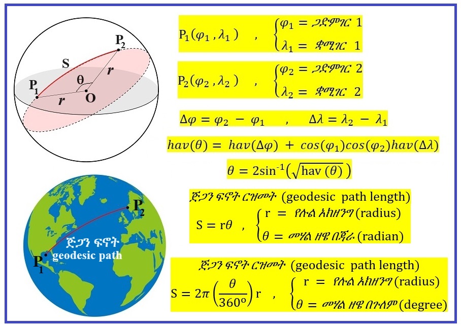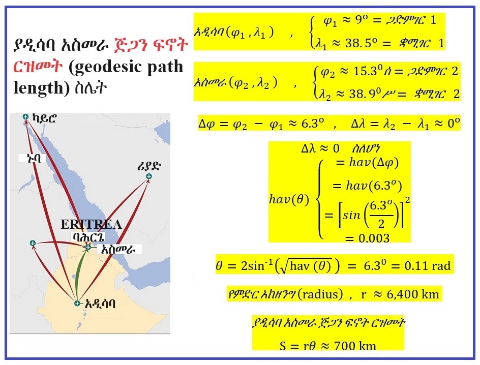 ለምሳሌ ያህል በአዲስ አባባ (Addis Ababa) እና አስመራ (Asmara) ኔፋልወደቦች (airports) መካክል ያለው ጅጋን ፍኖት ርዝመት (geodesic path length) በሚከተለው መንገድ ይሰላል።