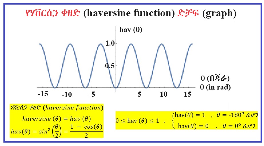የሃቨርሲን ቀዘድ (haversine) ድቻፍ (graph) በሚከተለው ሱርፊክ (figure) ላይ ተመልከቷል። ድቻፍ (graph) የሚለው ቃል የተገኘው ደቻፋሜ (ታጠፈ) ከሚለው የኦሮምኛ ቃል ነው። ግሱም ሲረባ ደቸፈ (to graph)፣ ድችፍ (ድቹፍ) [graphed]፣ ደቻፊ (grapher)፣ ድቸፋ (graphing)፣ ድችፈት፣ ድቻፌ፣ ድቻፎሽ እያለ ይሄዳል።