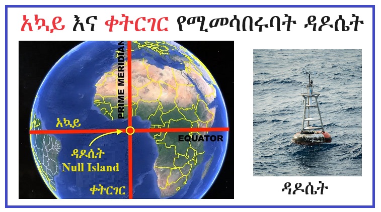 አኳይ (equator) እና ቀትርገር (prime meridian) የሚመመሳበሩባት (intersect) ማለትም የሚቆራረጡባት ነቁጥ (point) ዳዶሴት (Null Island) ትባላለች። ዳዶሴት (Null Island) የሚለው ቃል የተገኘው ደግሞ ዳዶ (zero) እና ደሴት (Island) ከሚሉት ቃሎች ነው፣ ቦታዋ ደረቅ ምድር የሌለባት በውሃ የተሸፈነች ባዶ ናትና። ዳዶ (zero) የሚለው ቃል የተገኘው ደግሞ ዱዋ (ማለትም ባዶ) ከሚለው የኦሮምኛ ቃል እና ባዶ ከሚለው ያማረኛ ቃል ነው።