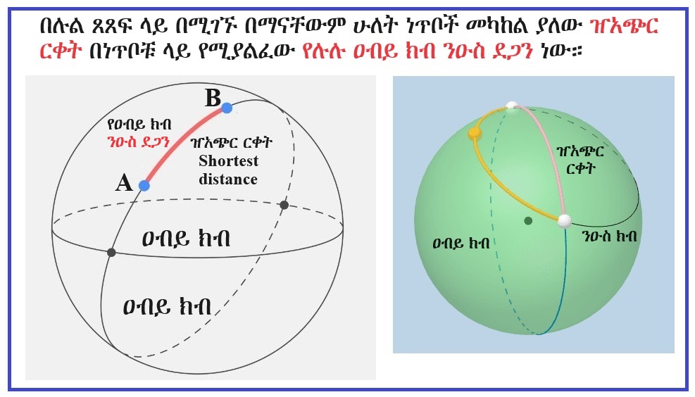 በሉል ገጽ ላይ በሚገኙ በማናቸውም ሁለት ነቁጦች መካክል ያለው ዠአጭር ርርቀት(shortest distance) በነጥቦቹ ላይ የሚያልፈው ዐብይክብ (great circle) ንዑስደጋን (minor arc) እንደሆነ ሁሉ በምድርም ላይ እንደዚሁ፣ ማለትም ምድር ፍጹም ሉል እንደሆነች ተደረጋ እስከተወሰደች ድረስ።