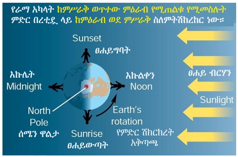 ፀሐይ፣ ጨረቃ፣ ከዋክብትና ሌሎች ራማዊ አካሎች (celestial objects) ከምሥራቅ አድማስ ወጥተው ወደ ምዕራብ አድማስ የሚጠልቁ የሚመስሉትም እነሱ በእውን በመንቀሳቀሳቸው ሳይሆን፣ ምድር ከምዕራብ ወደ ምሥራቅ በመሽከርከሯ ሳቢያ ነው።