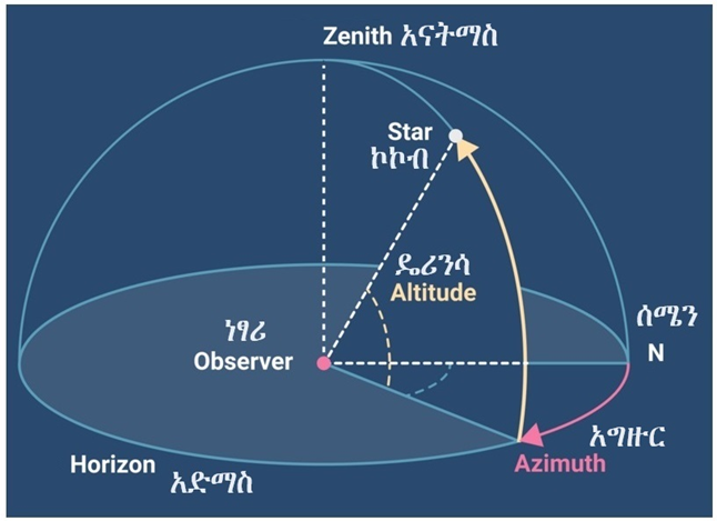 አግዙር (azimuth) የሚለው ቃል የተገኘው አግዳሚ ዙር ከሚለው ሐረግ ሲሆን፣ ዴሪንሳ (altitude) የሚለው ቃል የተገኘው ደግሞ ዴሪና (ማለትም ከፍታ) ከሚለው የኦሮምኛ ቃል ነው። አግዙር (azimuth) እና እግዜር እንዳይምታታብወት አደራ፣ ምንም ግንኙነት የላቸውምና።