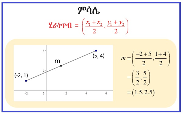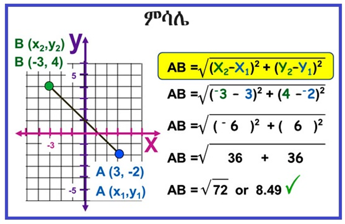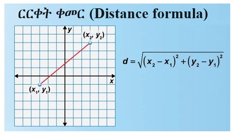 የማናቸውን ሁለት ነጥቦች (two points) ቀንጆች (coordinates) ከተሰጡ፣ በነጥቦቹ መካካል ያለውን ርርቀት (distance) በሚከተለው ርርቀት ቀመር (distance formula) መሠረት በቀላሉ ማስላት ይቻላል።