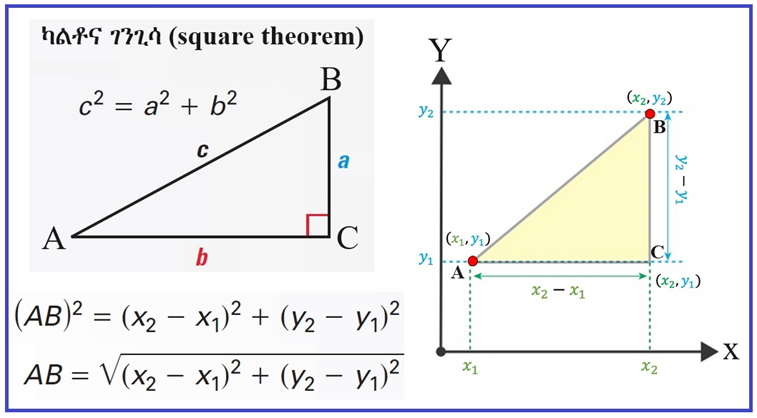 ይህ ርርቀት ቀመር (distance formula) የተገኘው ደግሞ ካልቶና ገንጊሳን (square theorem, Pythagorean theorem) በመጠቀም እንደሚከተለው ነው።