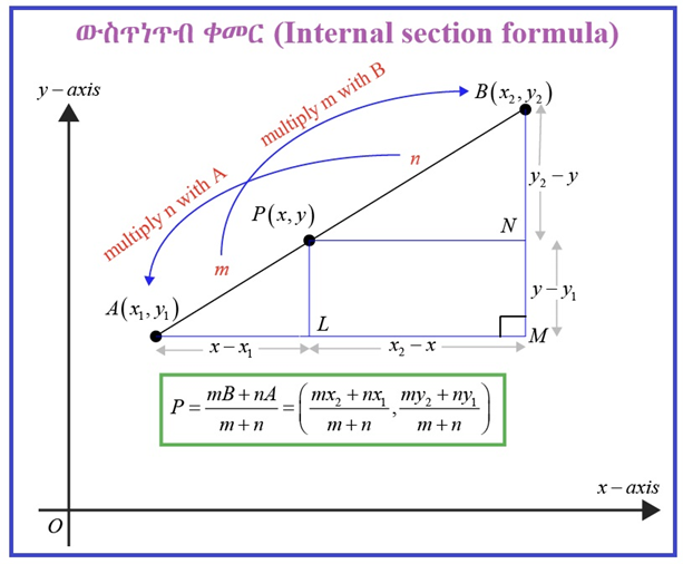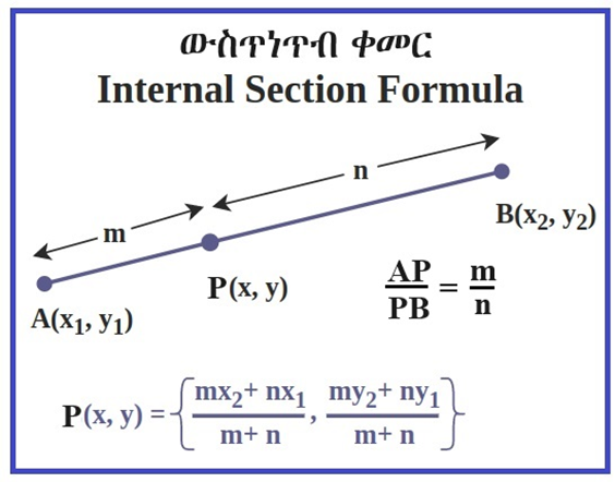 ማናቸውንም የቀጤ መስመር ዐጽቅ (straight line segment) m/n ለሆነ ርሻር (ratio) የሚከፍል፣ በዐጽቁ (segment) ላይ የሚውል ውስጣዊ ነጥብ (internal point) ቀንጆች (coordinates) በዐጽቁ ጫፎች (ends) ቀንጆች (coordinates) እንጻር በሚከተለው ውስጥነጥብ ቀመር (internal section formula) በሚባል ቀመር ይሰጣሉ።