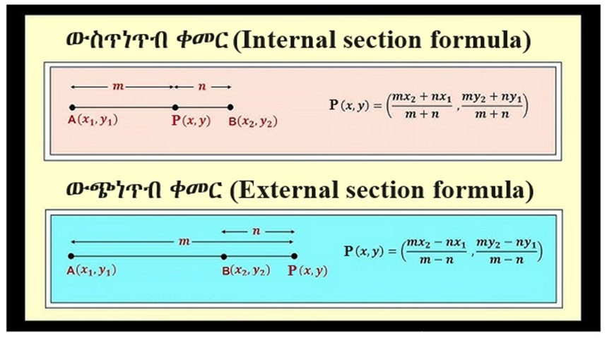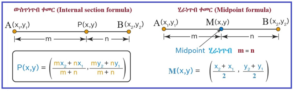 ለምሳሌ ያህል ሂራነጥብ ቀመር (midpoint formula) ማለት m = n የሚሆኑበት የውስጥነጥብ ቀመር (internal section formula) ልዩ ረገድ (special case) ነው።