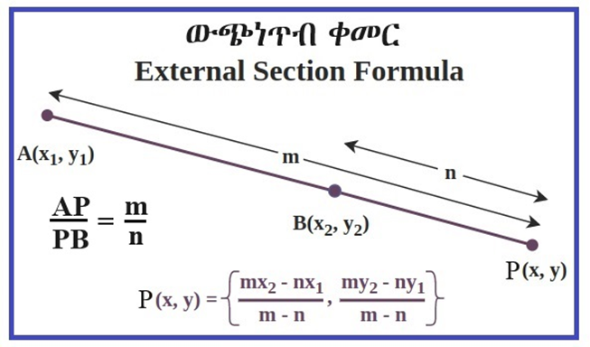 በተመሳሳይ መንገድ፣ ማናቸውንም የቀጤ መስመር ዐጽቅ (straight line segment) m/n ለሆነ ርሻር (ratio) የሚከፍል፣ ከዐጽቁ (segment) ውጭ የሆነ ውጫዊ ነጥብ (external point) ቀንጆች (coordinates) በዐጽቁ ጫፎች (ends) ቀንጆች (coordinates) እንጻር በሚከተለው ውጭነጥብ ቀመር (external section formula) በሚባል ቀመር ይሰጣሉ።