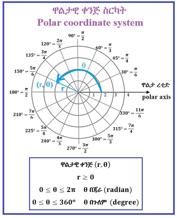 በዋልታዊ ቀንጅ (polar coordinate) (r, θ) ላይ፣ r ርቀት (distance) ስለሆነ ዳዶ (zero = 0) ወይም ወንታ (positive) ነው፣ ማለትም ሉንታ (negative) ሊሆን አይችልም። የዘዌ (angle) ድግግም እንዳይፈጠር ሲባል ደግሞ ዘዌ θ በ 0o እና 3600 የተወሰነ ነው።