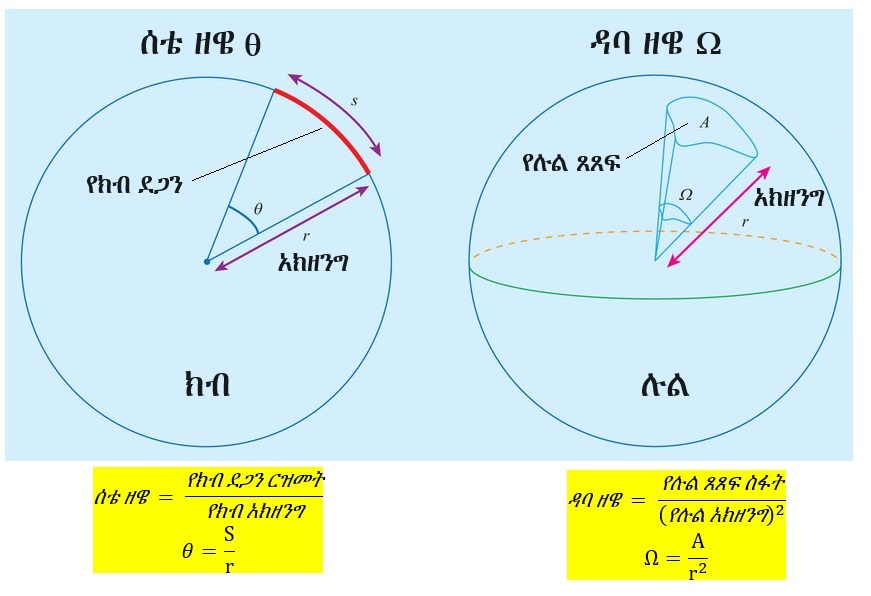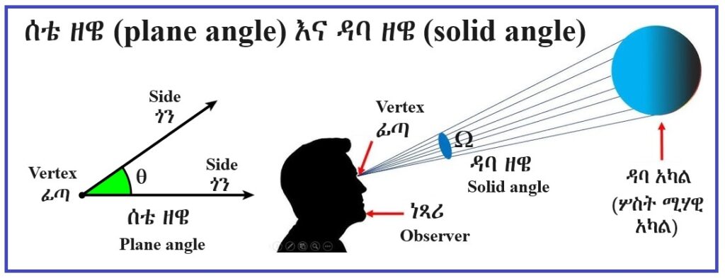 2. ዳባ ዘዌ (solid angle) ማለት ከነጥብ (point) በመነሳት የሚኖርን የእይታ መስክ (field of view) መጠን መለኪያ ነው።