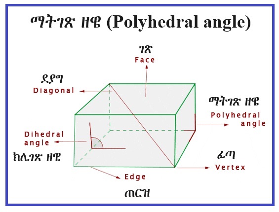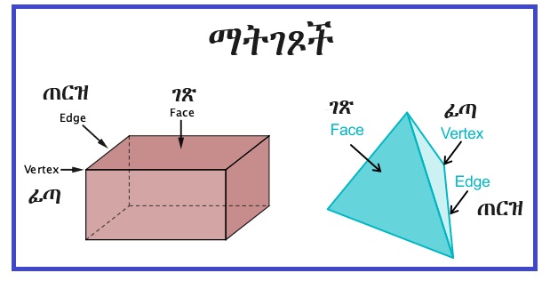 2. የማትገጽ (polyhedron) ማትጎናዊ ሰቴወች (planes) ገጾች (faces) ሲባሉ፣ ገጾቹ የሚጋጠሙባቸው መስመሮች (lines) ደግሞ ጠርዞች (edges)፣ ጠርዞቹ የሚጋጠሙባቸው ነጥቦች (points) ደግሞ ፊጣወች (vertices) ይባላሉ።  ፊጣ (vertex) ማለት በኦሮምኛ ጫፍ ማለት ነው።