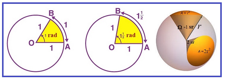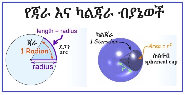 2. አንድ ካልጃራ (steradian, sr) የሚበየነው (defined) ደግሞ ስፋቱ የሉልን አክዘንግ ካልቶና የሆነ (A = r2) የሉል ጸጸፍ በሉሉ መሃል ላይ የሚወጥገው (subtend) መሃልዘዌ (central angle) ነው ተብሎ ነው።
