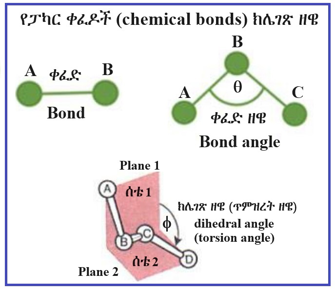 ፓካር (chemical) የሚለው ቃል የተገኘው ዐቃር (ማለትም ቅመም) ከሚለው የግእዝ ቃል ነው።  ከዚህም ፓካርሲን (chemistry)፣ ፓካርሲነኛ (chemist) የሚሉትን ቃሎች እናገኛለን።  ቀፈድ (bond) ማለት ደግሞ የሚቀፍድ፣ የሚያስተሳስር ማለት ሲሆን፣ ቃሉ የተገኘው ቀፈደ (ሸክምን፣ ሣርን፣ ነዶን ሰብስቦ አሰረ) ከሚለው ያማረኛ ቃል ነው፣ ቀፈደደ እንዲሉ አጥብቆ አሰረ ሊሉ።  ከዚህም ፓካር ቀፈድ (chemical bond)፣ ቀፈድ ርዝመት (bond length)፣ ቀፈድ ጉልበት (bond energy)፣ ቀፈድ ዘዌ (bond angle) የመሳሰሉትን ቃሎች እናገኛለን።