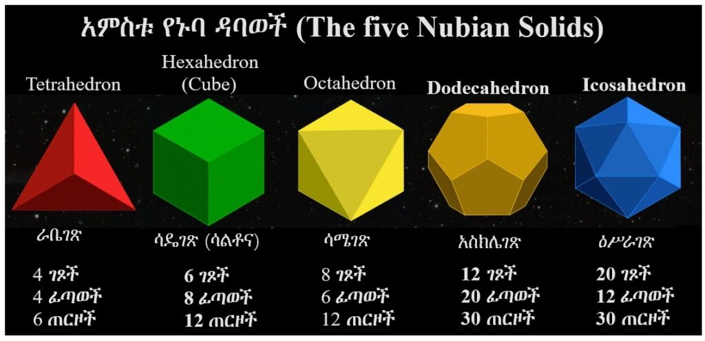 ደንብገኛ ማትገጾች (regular polyhedrons) አምስቱ የአፍላጦን ዳባወች (the five Platonic solids) በመባልም ይታወቃሉ፣ ግሪካዊው አፍላጦን (Plato) ከራሱ አእምሮ ያፈለቀው ነው በሚባለው ሥራው ውስጥ በሰፊው አውስቷቸዋልና።  እኛ ግን የግሪክ የሚባለው ፍልስፍና ሁሉ ከኑባ (Nubia) የተወሰደ የሥርቆሽ ፍልስፍና ነው ስለምንል፣ አምስቱ የአፍላጦን ዳባወች (the five platonic solids) የሚባሉትን አምስቱ የኑባ ዳባወች (the five Nubian solids) እንላቸዋለን።