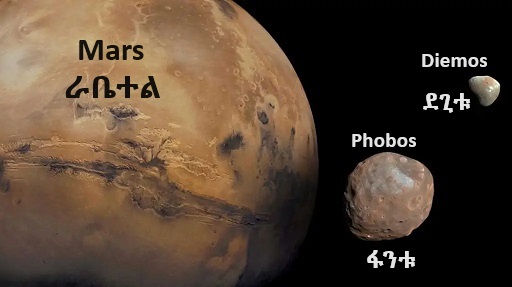 ሃዴተል (Mercury) እና ክሌተል (Venus) አጊናወች የሏቸውም። ስሌተል (Earth) ማለትም ምድር አንድ አጊና አላት፣ እሷም ጨረቃ (moon) ትባላለች። ራቤተል (Mars) ሁለት አጊናወች አሏት፣ እነሱም ፋንቱ (Phobos) እና ደጊቱ (Diemos) ይባላሉ። ፋንቱ እና ደጊቱ የሚሉት ስሞች የተመረጡት ከንግሊዘኛወቹ ስሞች ጋር ባጠራር ስለሚቀራርቡ ነው።