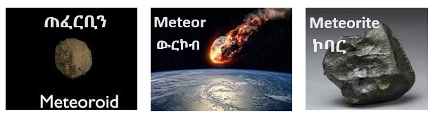 የእንግሊዘኛወቹ ስያሜወች (meteoroid, meteorite, meteor) አንዱን ከሌላው ለመለየት በጣም የሚያስቸግሩ መሆናቸውንና ያማረኛወቹ አቻወቻቸው (ጠፈርቢን፣ ውርኮብ፣ ኮባር) ግን በቀላሉ የሚታወሱ ግልጾች መሆናቸውን ያስተውሉ።