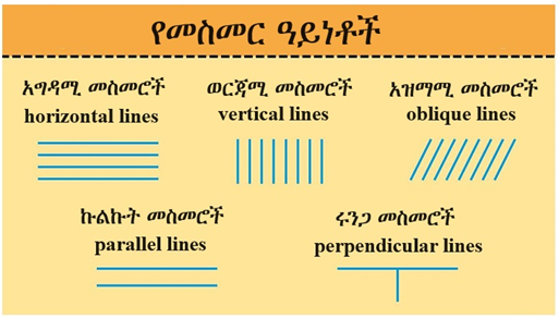3. ባግዳሚ (horizontal) እና በወርጃሚ (vertical) መካከል የሆነ መስመር አዝማሚ መስመር (oblique line) ወይም ዘማማ መስመር (oblique line) ይባላል።