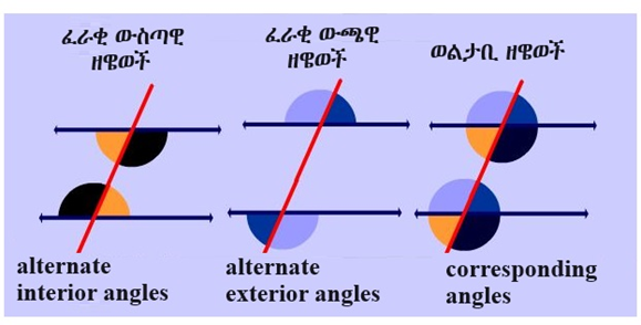ፈራቂ ዘዌወች (alternate angles) እና ወልታቢ ዘዌወች (corresponding angles)