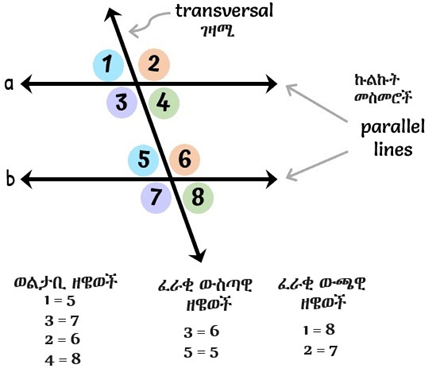 3. ወልታቢ ዘዌወች(corresponding angles) እኩል ይሆናሉ።