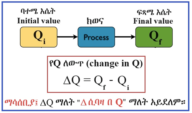4. ΔQ ማለት በ Q ላይ የተከሰተ ለውጥ ወይም Q ለውጥ (change in Q) ማለት ሲሆን፣ የሚነበበውም ዴልታ ኪው (delta Q) ተብሎ ነው።