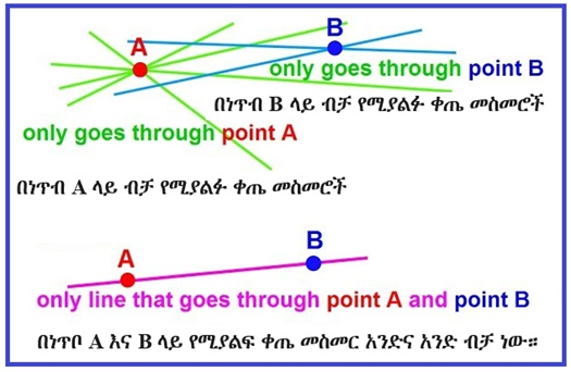 ሁለት ልይጥ ነጥቦች (two distinct points) አንድን ቀጤ መስመር (straight line) ይለችማሉ (uniquely determine)፣ ማለትም በልቹ (unique) ሁኔታ ይወስናሉ።  በሌላ አባባል በሁለት የተለያዩ ነጥቦች ላይ የሚያልፍ ቀጤ መስመር (straight line) አንደና አንድ ብቻ (one and only one)  ነው።