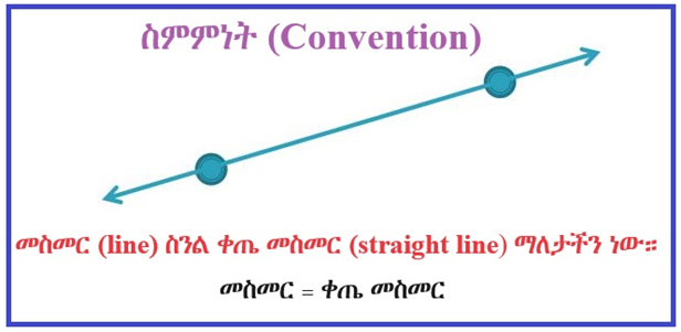 ካሁን በኋላ ቀጤ መስመር (straight line) የሚባለውን ባጭሩ መስመር (line) እንለዋለን።  በሌላ አባባል ካሁን በኋላ መስመር (line) ስንል ቀጤ መስመር  (straight line) ማለታቸን ነው ብለን እንስማማለን።