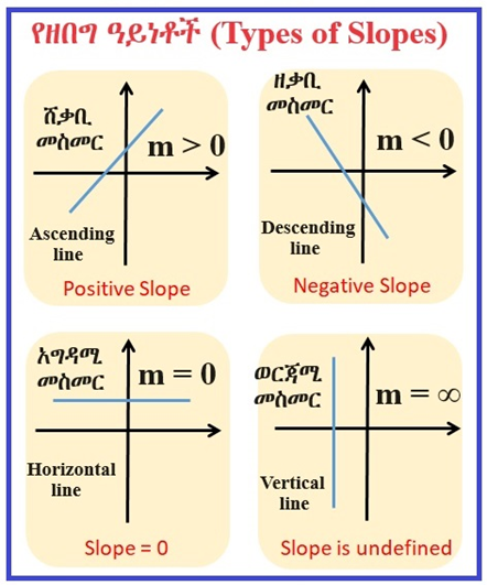 1. ያግዳሚ መስመር (horizontal line) ዘበግ (slope) ዳዶ (zero = 0) ነው።
