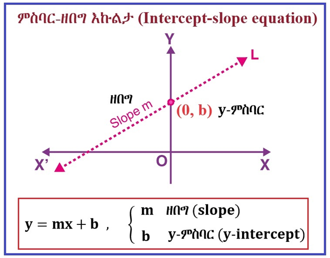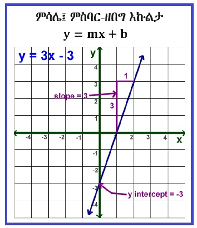 2. የመስመር እኩልታ ዘበግምስባር መልክ (slope-intercept form) ወይም ባጭሩ ዘበግምስባር እኩልታ (slope-intercept equation)