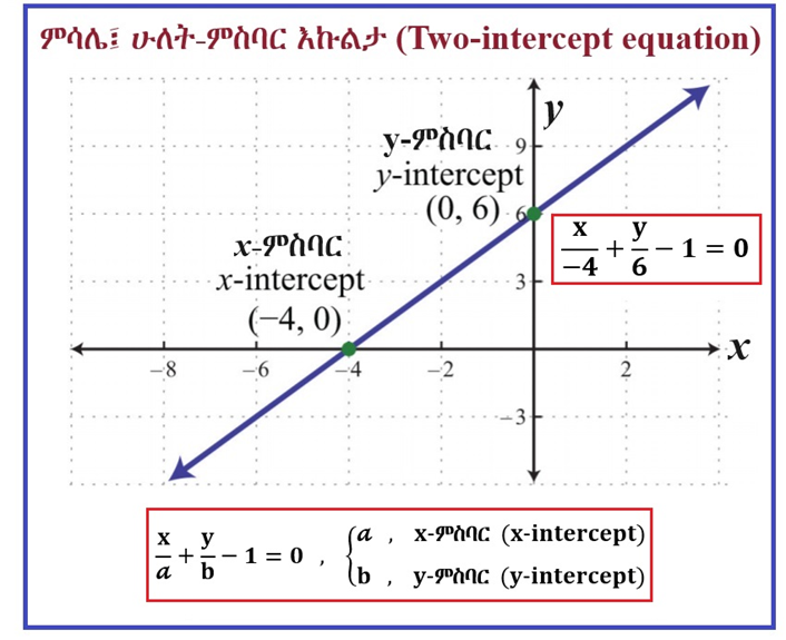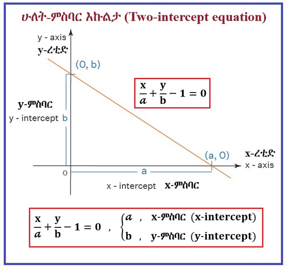 4. የመስመር እኩልታ ሁለትምስባር መልክ (two-intercept form) ወይም ባጭሩ ሁለትምስባር እኩልታ (two-intercept equation)