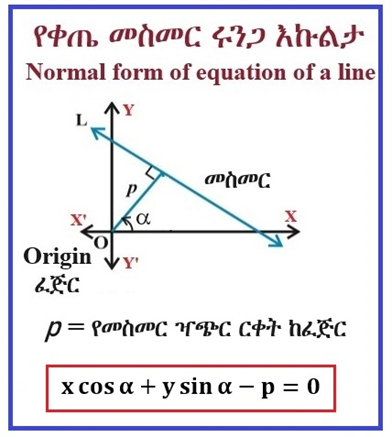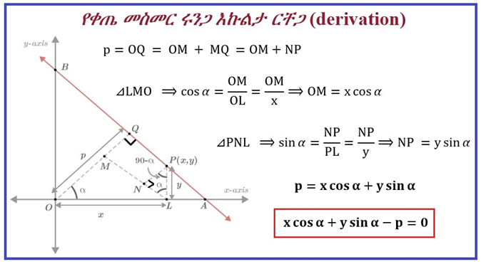 2. እንዲሁም ፈጅርን (origin) ከመስመሩ ጋር የሚያገኛነው ሩንጋ አፅቅ (perpendicular segment) ከወንታ x-ረቲድ (positive x-axis) ጋር የሚሰራው ዘዌ (angle) በኢሰዓትያ አቅጣጫ (anticlockwise direction) ሲለካ α ነው እንበል።