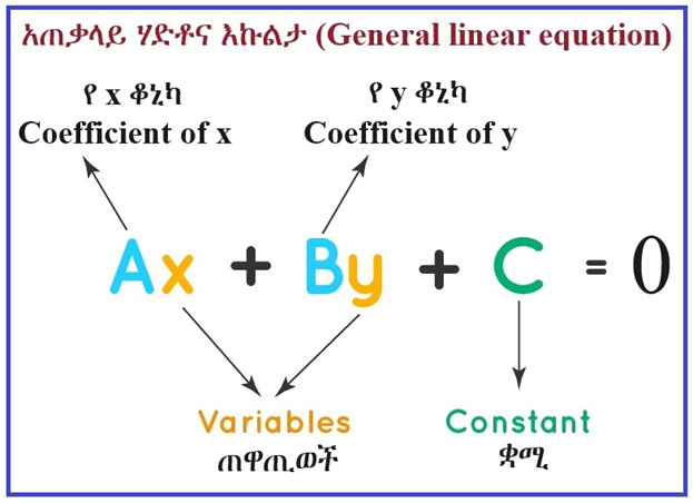 6. የመስመር እኩልታ አጠቃላይ ሃድቶና እኩልታ መልክ (general linear equation form)  ወይም ባጭሩ አጠቃላይ ሃድቶና እኩልታ (general linear equation)