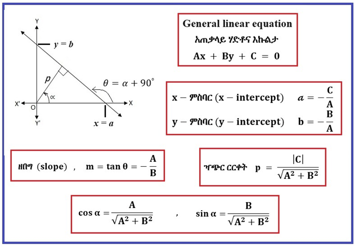1. የማናችውም ቀጤ መስመር እኩልታ (equation of straight line) በዚህ አጠቃላይ ሃድቶና እኩልታ(general linear equation) መልክ ሊገለጽ ይችላል።