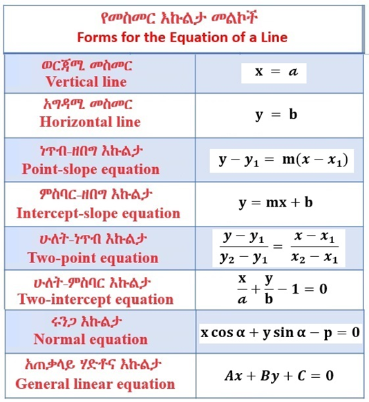 የማናቸውም አልወርጃሚ መስመር እኩልታ (equation of nonvertical line) በሚከተሉት ስድስት መልኮች (three forms) ሊጻፍ ይችላል።