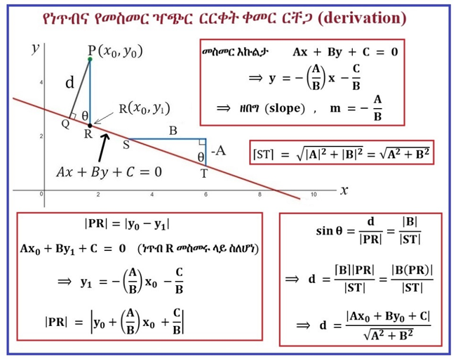 የነጥብና የመስመር ዣጭር ርርቀት (shortest distance) ቀመር (formula) ርቸጋ (derivation) ማለትም አገኛኘት በሚከተለው ሱርፊክ (figure) ላይ ተመልክቷል።