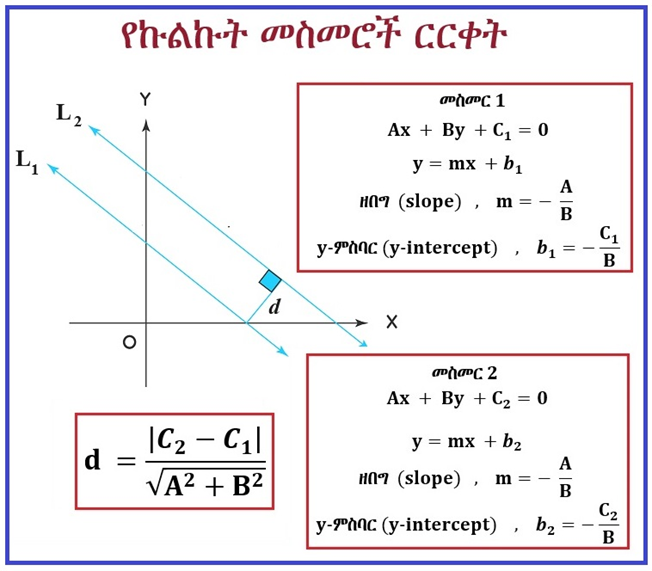 በሁለት ኩልኩት መስመሮች (parallel lines) መካከል ያለው ርርቀት (distance) በሚከተለው ቀመር ይሰጣል።